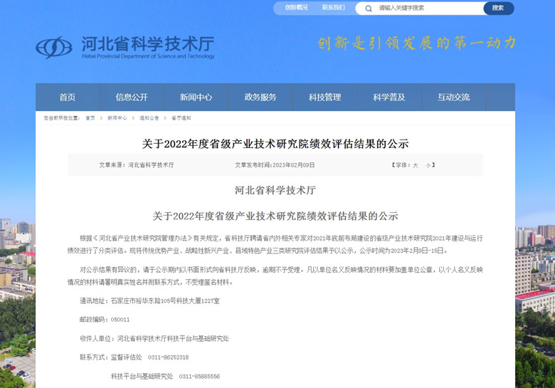 2023年2月9日,河北省科技廳發布了關于2022年度省級產業技術研究院績效評估結果的公示。經評估,我公司建設運行的“河北省綠色建筑產業技術研究院”榮獲戰略性新興產業類研究院優秀等次。