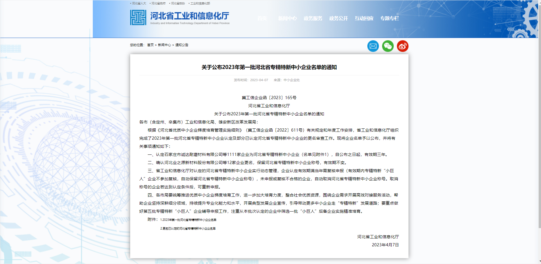 2023年4月7日,河北省工業(yè)和信息化廳發(fā)布《關(guān)于公布2023年第一批河北省專精特新中小企業(yè)名單的通知》,河北冀科工程項目管理有限公司被認(rèn)定為2023年“專精特新”中小企業(yè)。